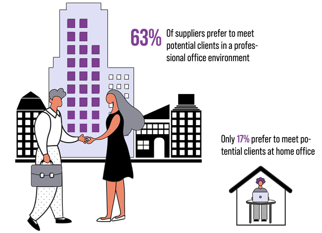 We found that even though meeting in a professional environment is the best and safest way for suppliers to meet potential clients, views on other meeting places outside the office have changed over the past 5 years. The future of work now entails Hybrid workplaces that are becoming far more acceptable, with over 70% of responses claiming that meeting in a café in 2021 does not negatively impact on choosing a professional supplier.